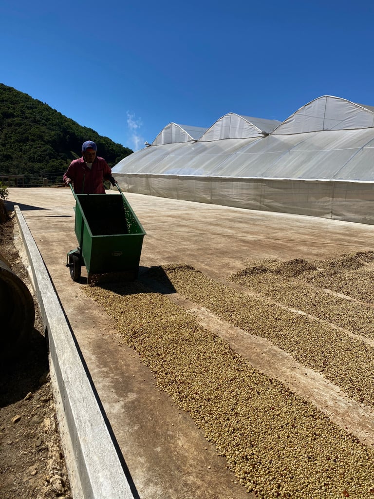 これはロジャーが特に得意とするプロセスです。シンプルで、失敗しにくく、彼らのユニークな品種とテロワールを引き立てます。果実がミルに入ると、チェリーは彼らの機械で処理され、種が取り出され、パーチメントが機械で洗浄されます。ムシレージがごくわずか残ったきれいな種は、コンクリート製パティオで2日間乾燥されます。その後、コーヒーは高床式乾燥ベッドに移され、温室で10日間、毎日頻繁に移動されます。